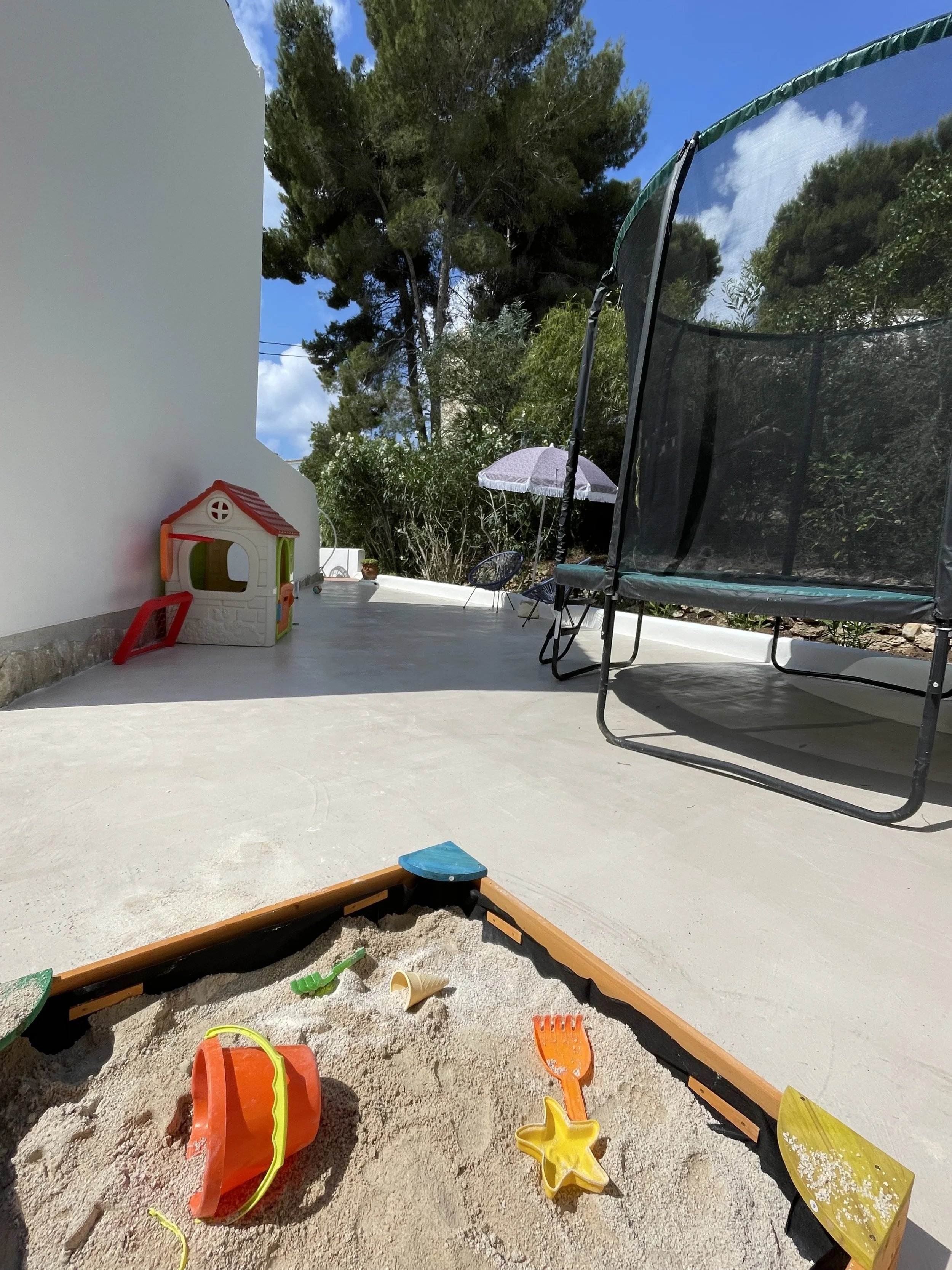 The swimming pool is surrounded by several terraces with comfortable sun loungers, an outdoor shower, chill-out area and a BBQ. There is also a lovely kids playground with a trampoline, and this part can be fenced from the swimming pool. Finally, the house offers many facilities for younger children, like two baby cots, dining furniture, and play amenities.